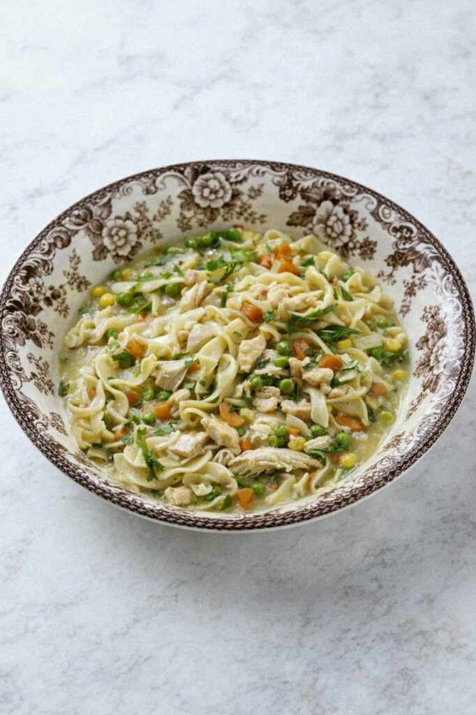All the comfort of chicken pot pie without the hassle of rolling out pastry or waiting for anything to bake. You get that creamy, herb-filled filling served over noodles instead, and honestly, it’s easier to eat this way. The flavors are exactly what you’re craving when you want something cozy.