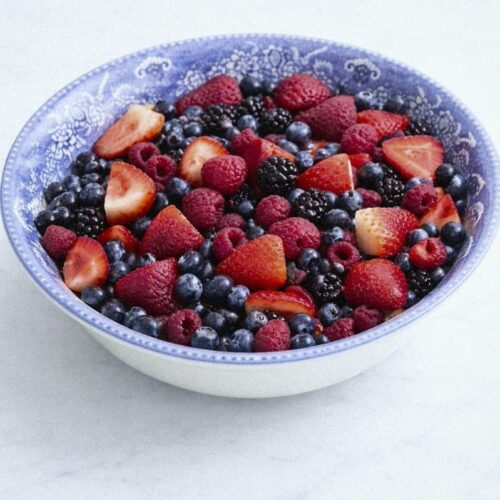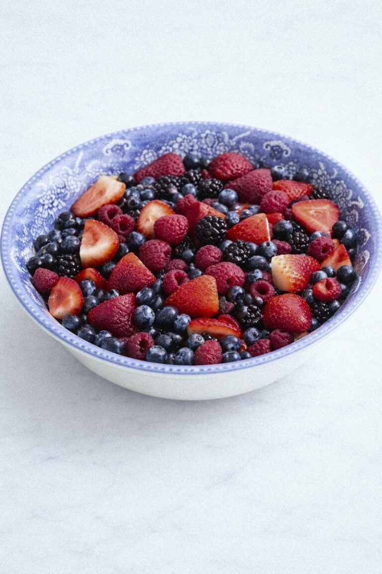 • Combine strawberries, blueberries, and blackberries in a large serving bowl.