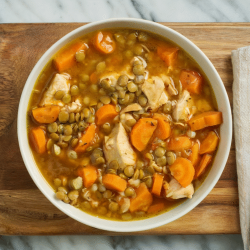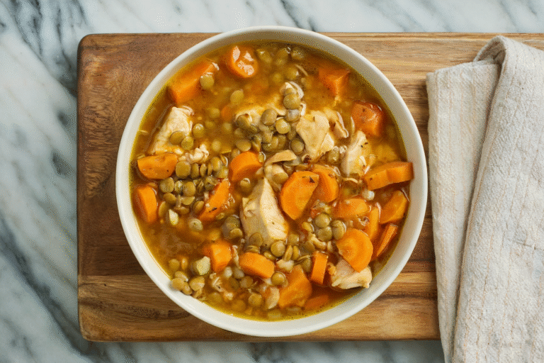 Browning chicken cubes before adding liquid gives you flavor you’d miss by just poaching. The lentils cook right in the soup, no pre-soaking needed.
