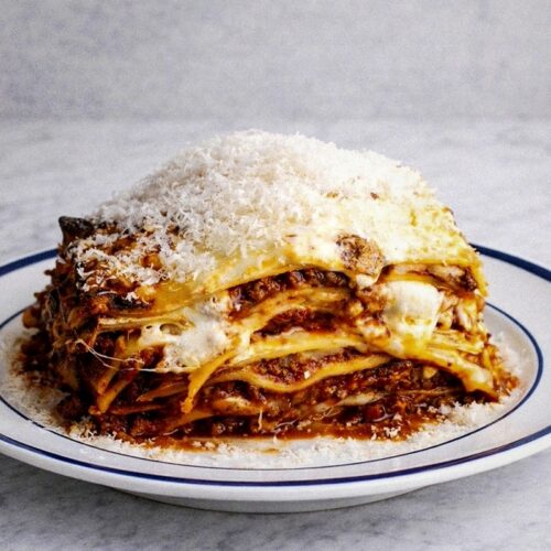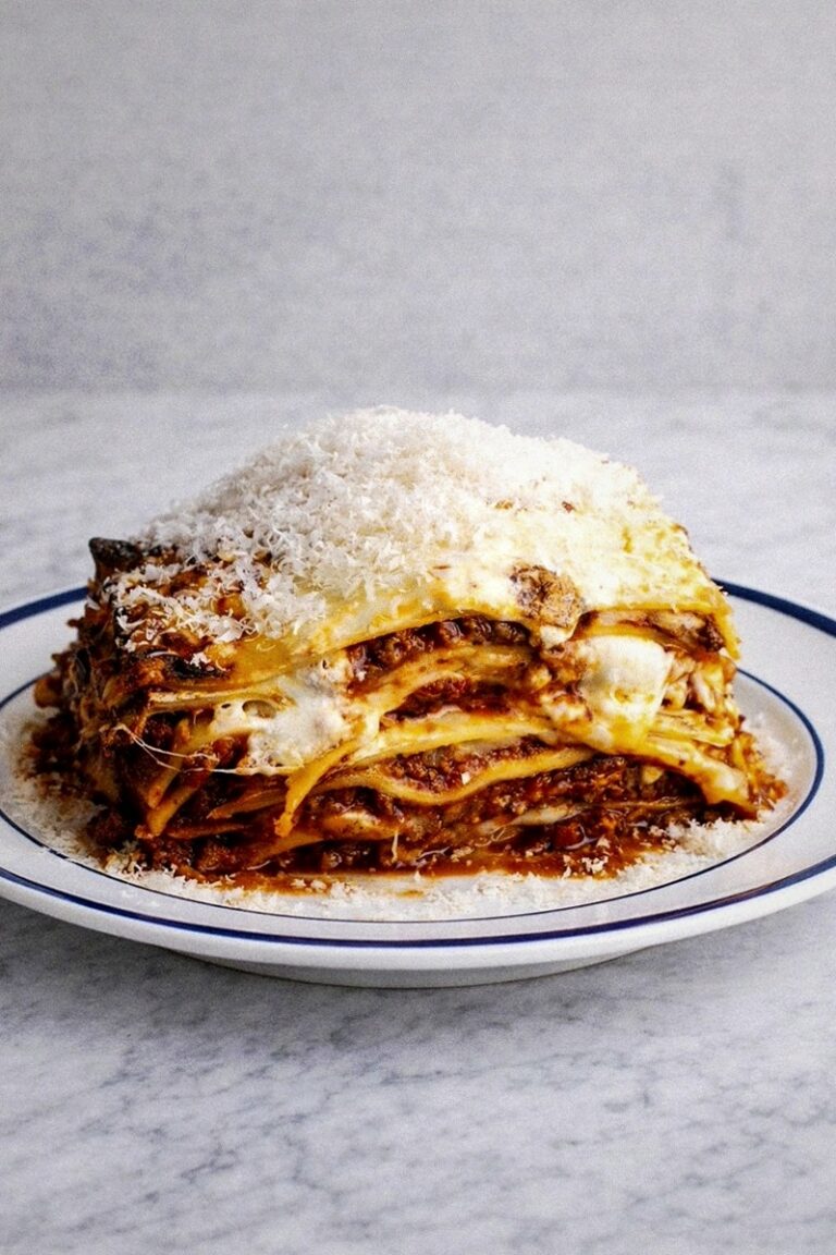 - Layer lasagna with noodles, Bolognese, bechamel, mozzarella, and parmesan.