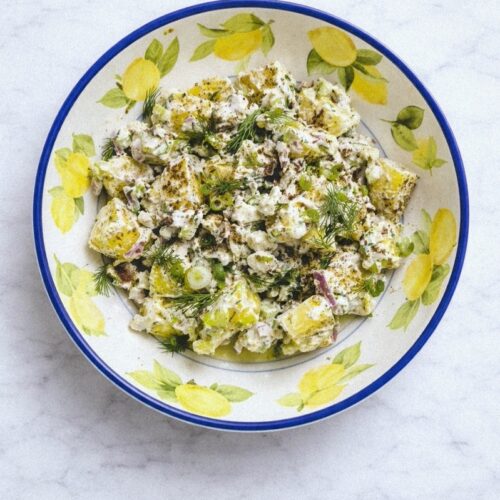 Once the potatoes are just barely warm, fold them into the dressing and mix-ins until they’re really well coated. Don’t be too aggressive or you’ll break up the potatoes.