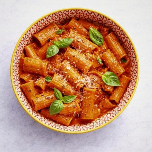 This is a solid weeknight pasta that cooks everything in one pan – no need to dirty multiple pots. The vodka cooks out completely and just adds depth to the tomato base.