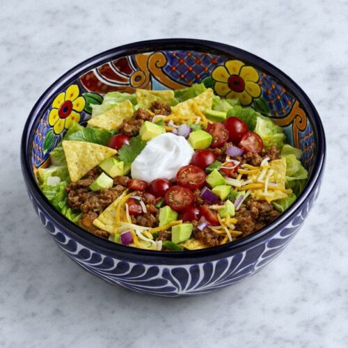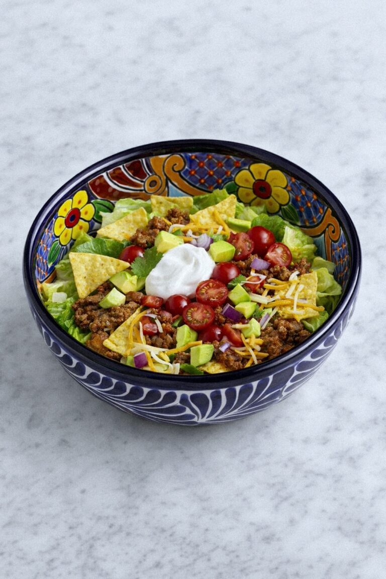 Top each serving with the lightly crumbled tortilla chips, then the seasoned beef mixture while it’s still warm.