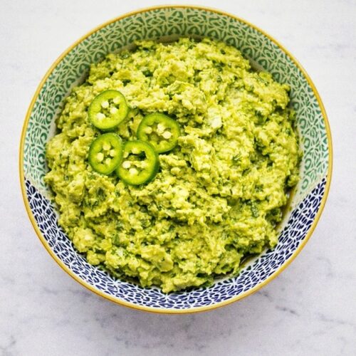 Using a fork, mash the avocado together with the onion and jalapeño – but leave some chunks of avocado for texture.