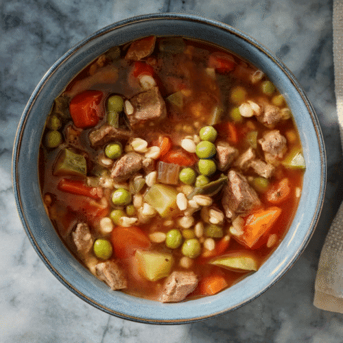 Browning beef cubes creates fond on the pot bottom - those crusty bits dissolve into pure flavor. Pearl barley needs the full hour to get tender, don't rush it.